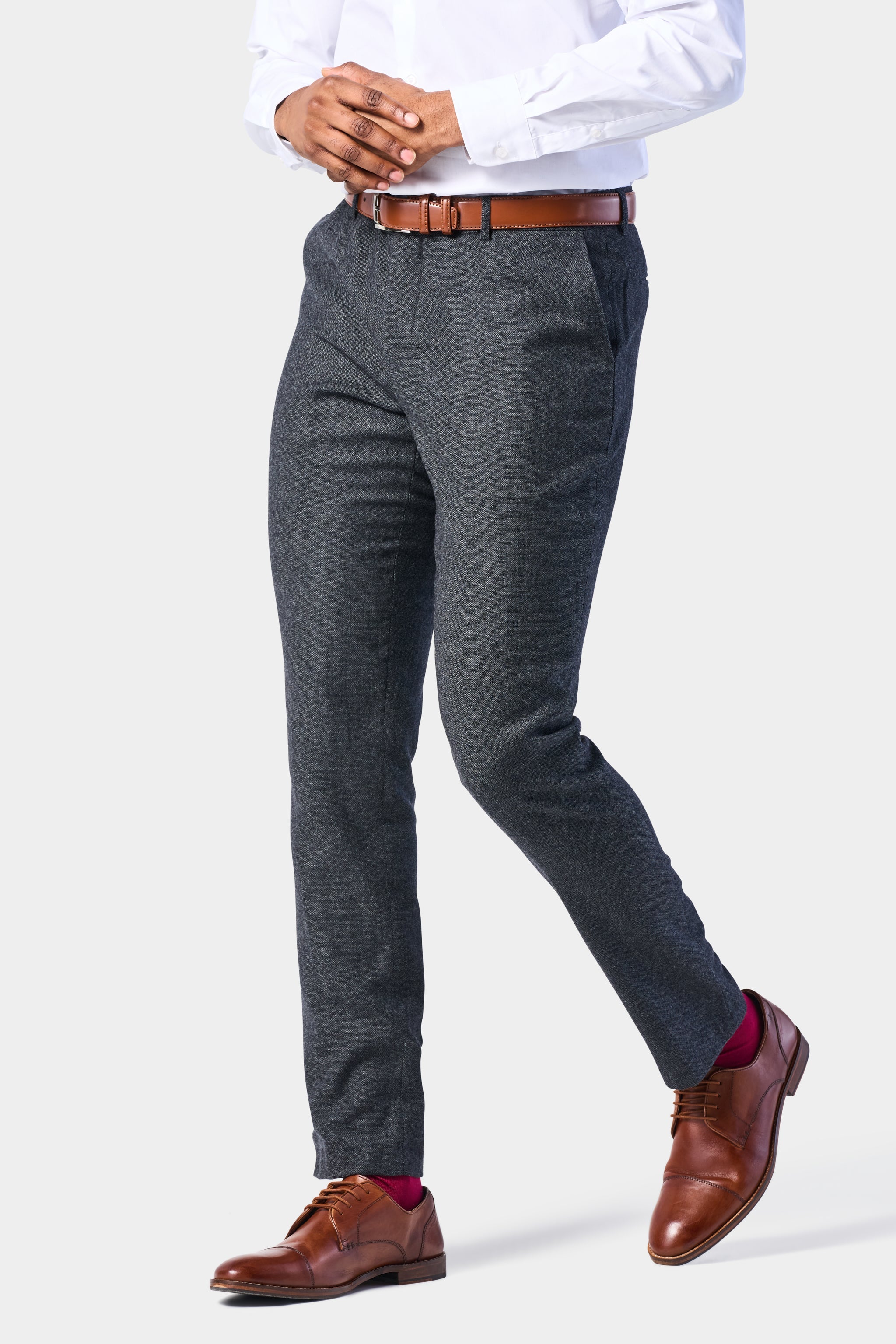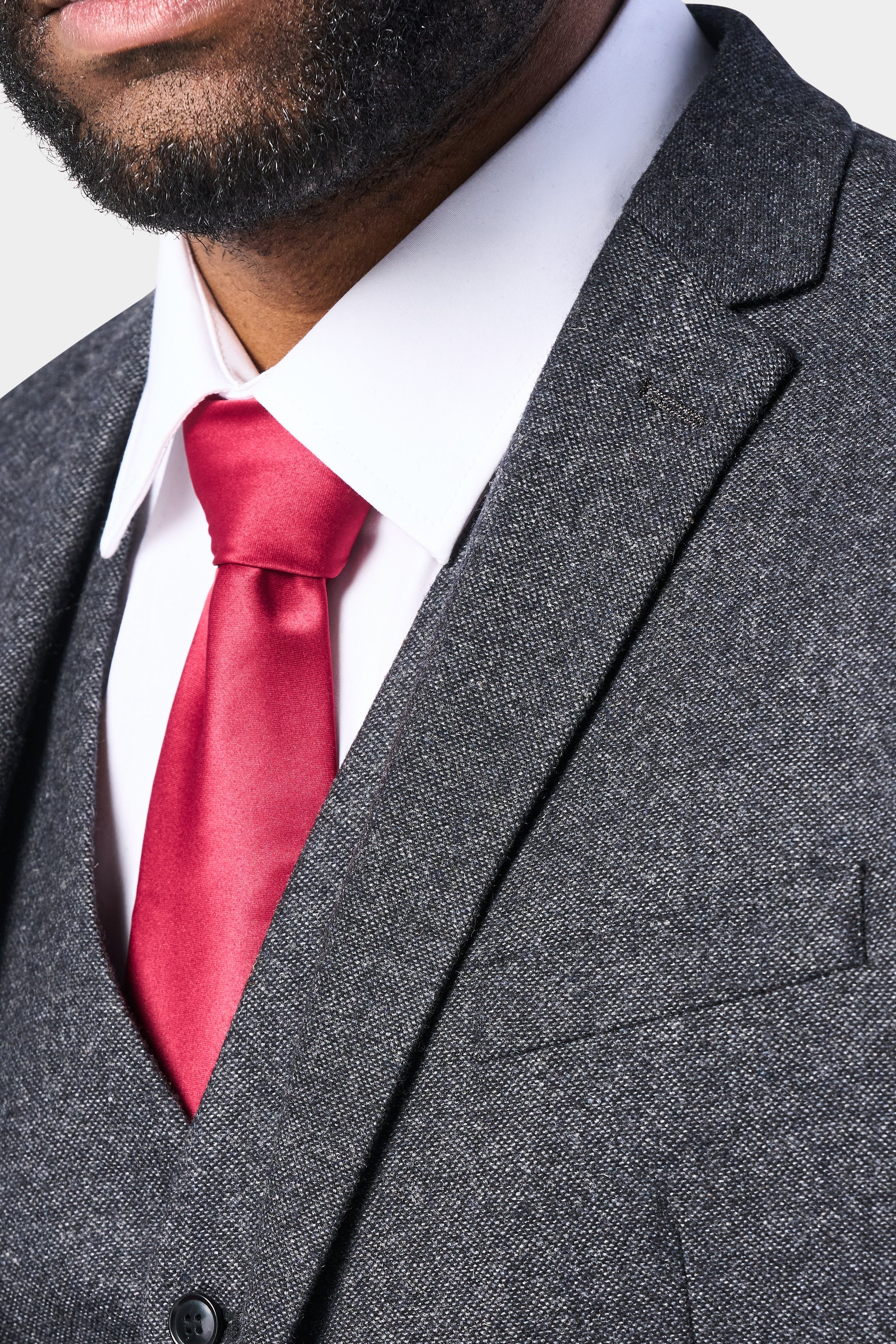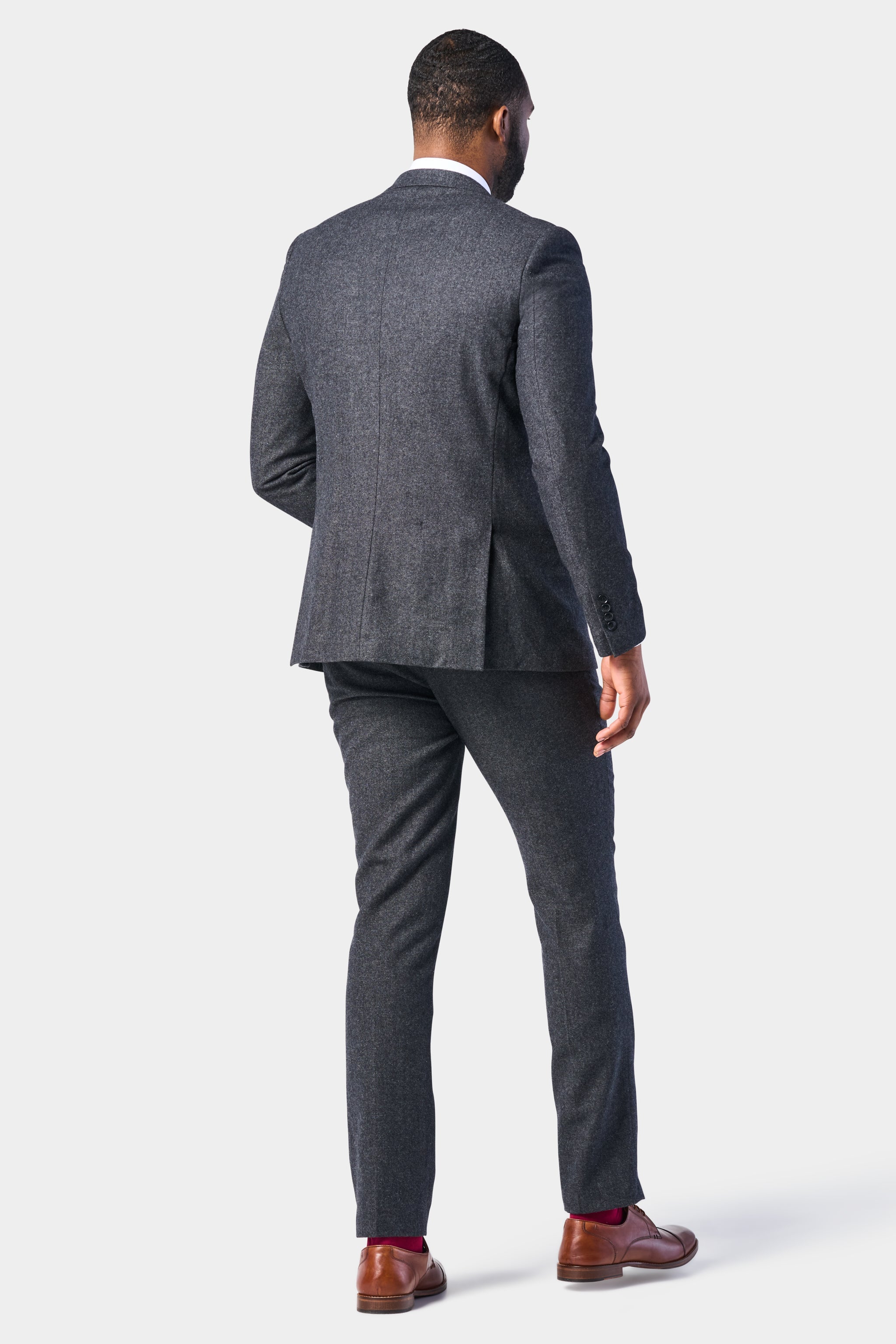 This splendid charcoal gray tweed suit is a perfect choice for formal occasions. Match it with a crisp white shirt, a black tie, and patent leather shoes for a classic look. You can also accessorize your suit with a colorful pocket square and leather loafers for an impressive look. The deep charcoal gray color provides a stylish and versatile base for creative formal accessories.