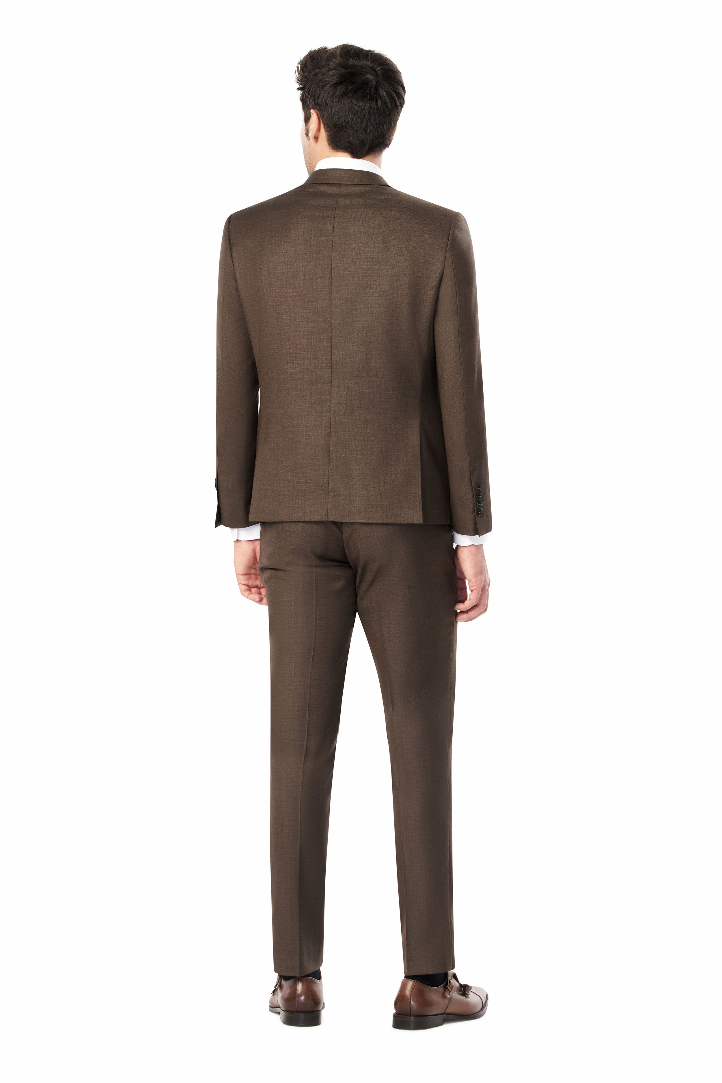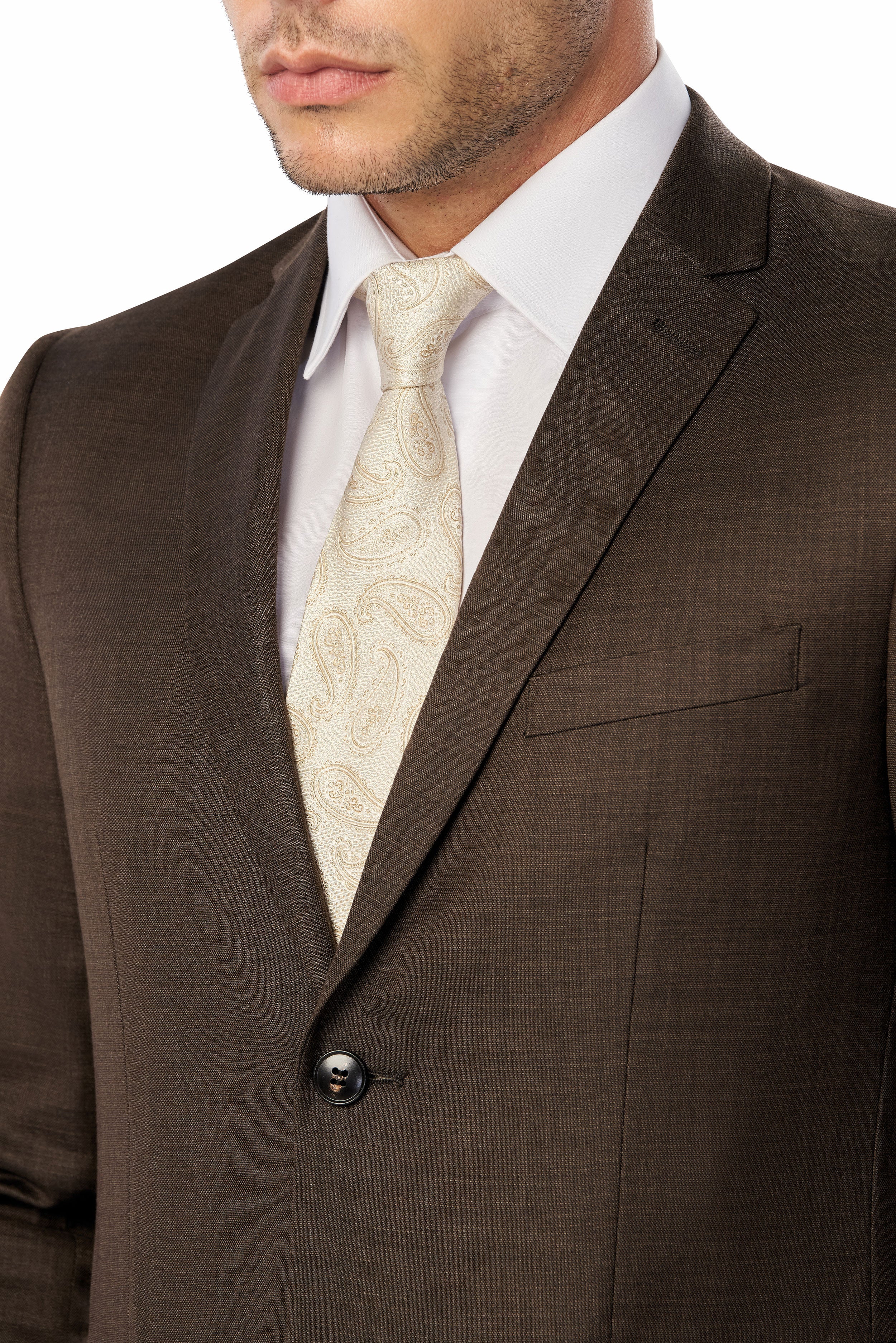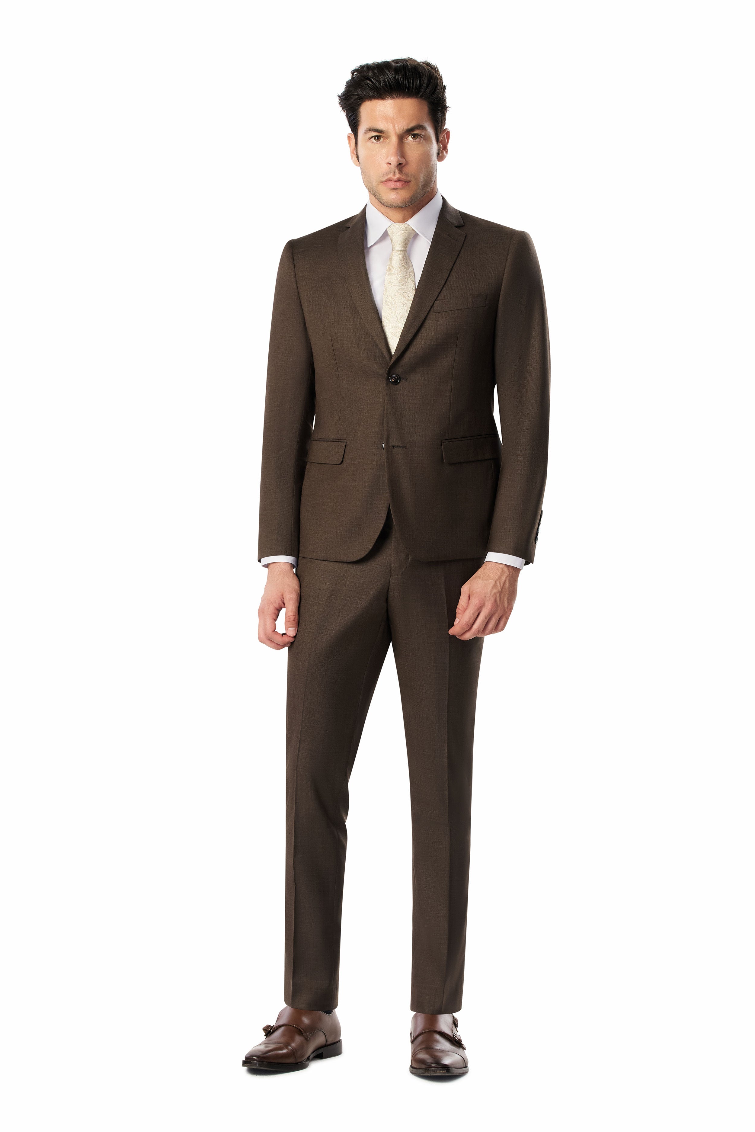 This versatile brown sharkskin suit transitions seamlessly from important meetings to weddings and casual outings. For professional settings, pair it with a white shirt, solid tie, and oxfords for an authoritative look. For formal events, match with a white shirt, ornamental pocket square, and sleek leather loafers to exude confidence. The versatile chocolate brown color makes the suit even more elegant.