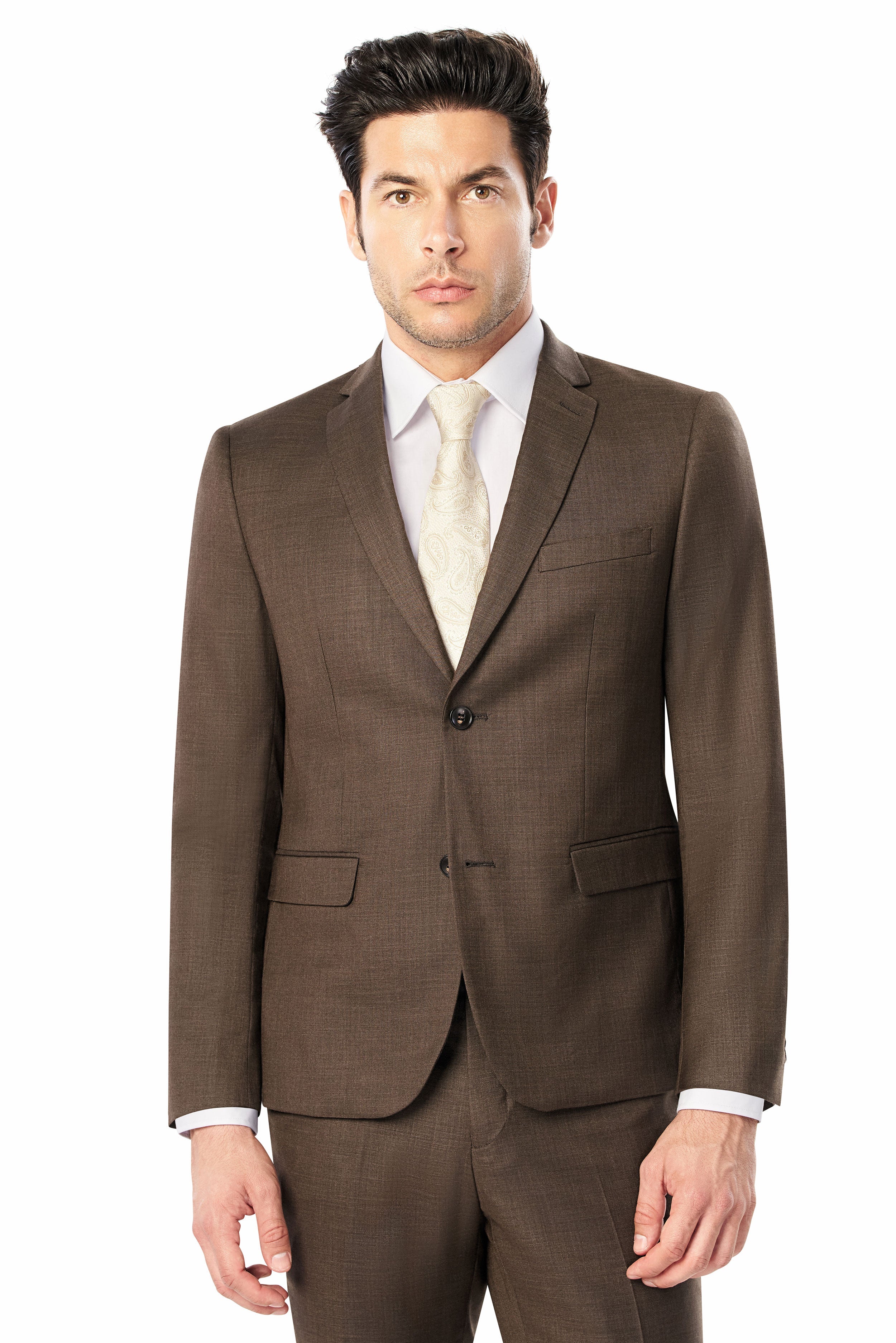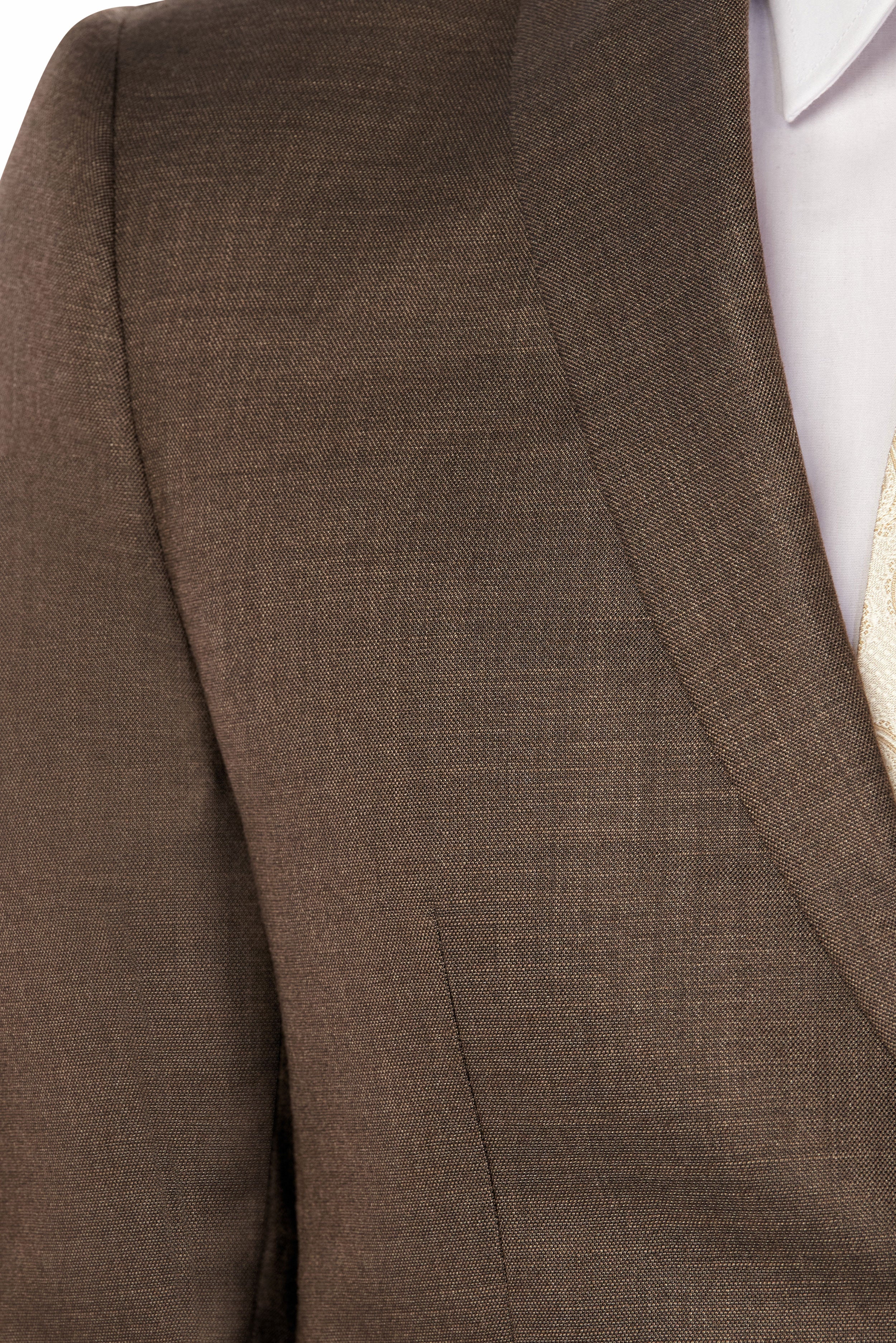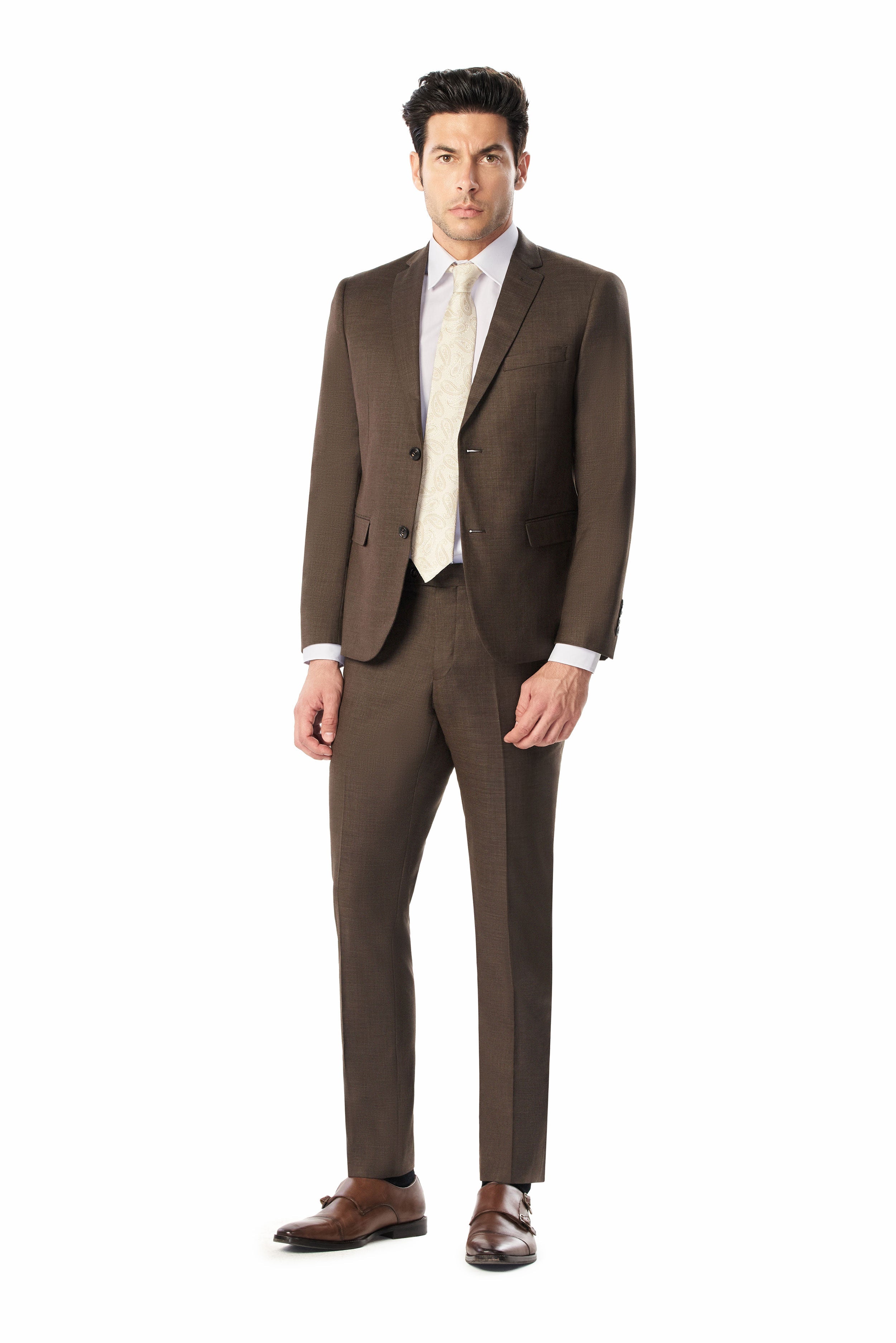 Captivate attention in this sharp chocolate brown sharkskin suit exquisitely crafted with subtle platinum sharkskin patterned weave. This sophisticated two-button suit is precisely tailored for today's gentleman seeking a polished, elegant look. Featuring a classic notch lapel collar, two-button closure, and a contemporary slim fit, it creates an impeccably refined silhouette perfect for demanding professional settings and formal events.