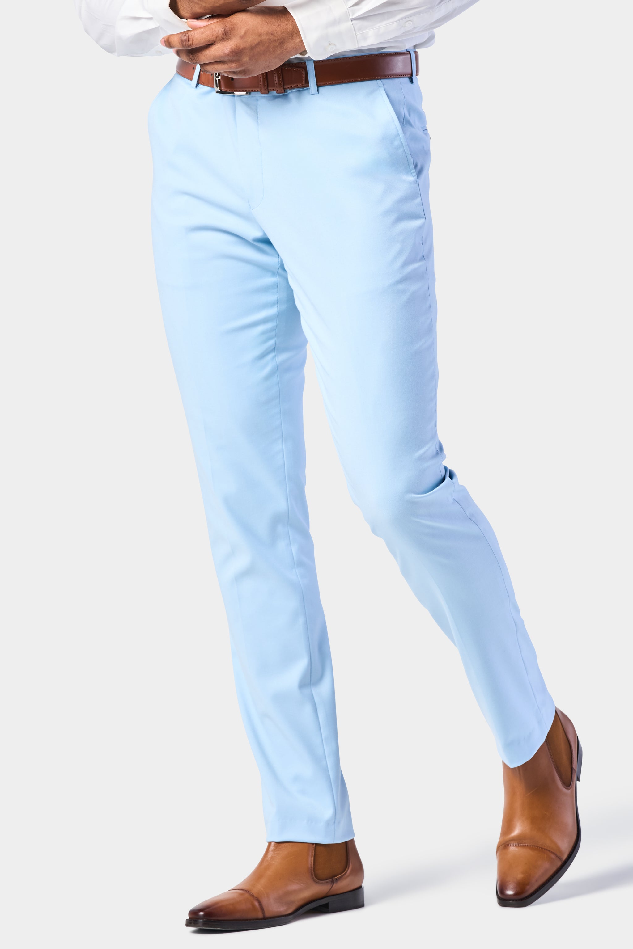 The tailored sky blue jacket comes with a two-button front closure with a classic notched lapel collar. The fit is slim yet comfortable with angled flap pockets and lightly padded shoulders. Also, it comes with double rear vents for ease of movement. Four-button cuffs and a luxurious teal patterned lining complete the premium construction. The flat-front pants also feature unfinished hems which allows you to customize the length to suit you.