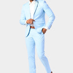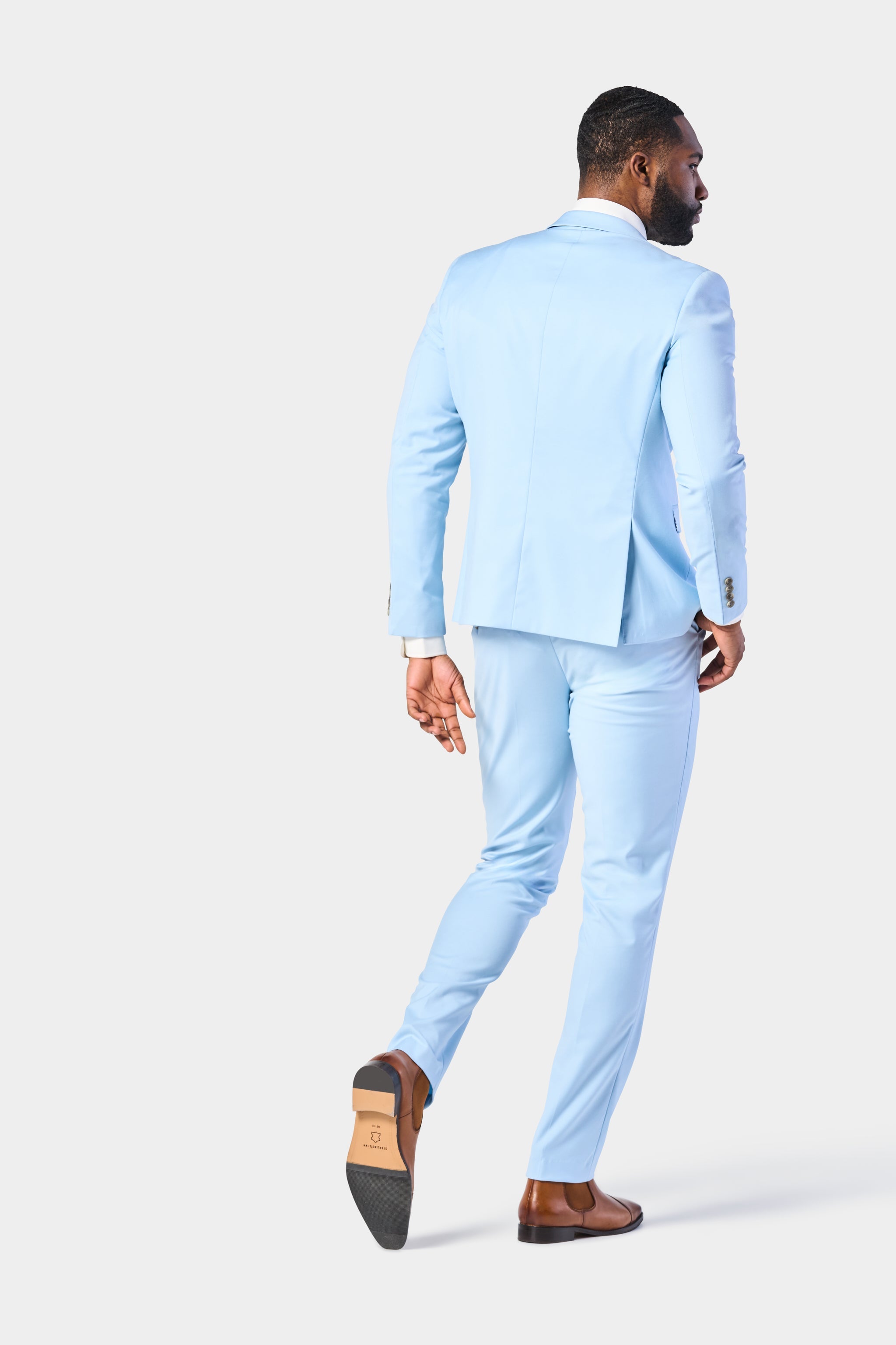 Stand out from the crowd in this refreshingly stylish sky-blue two-button suit. Perfect for spring and summer weddings, garden parties, or any occasion calling for a dapper yet breezy look, this suit will have you feeling confident and cool. The suit is skillfully tailored and features versatile color, which allows you to style it in countless ways, always looking stylish and cool.