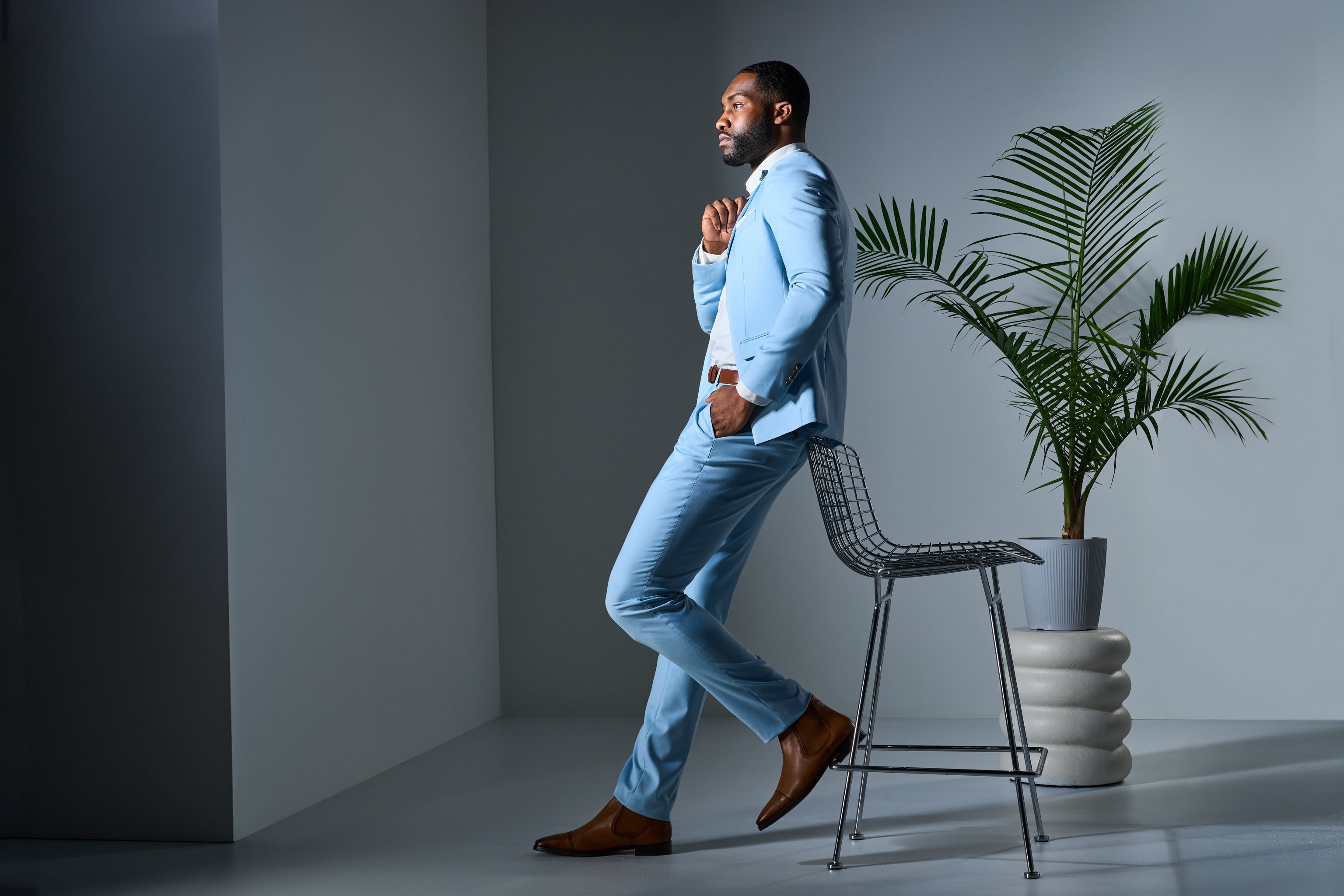 Let this sky-blue suit be the stylish centerpiece for your various spring and summer occasions. For a crisp, classic look at weddings or garden parties, pair it with a white dress shirt, light blue patterned tie, pocket square, and tan oxfords or loafers. For a modern vibe, style it with a printed shirt and no tie, adding a vest or double-breasted waistcoat.